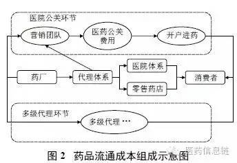 從藥品流通成本的具體構成來看,我國藥品流通框架內(nèi)形成了醫(yī)院公關體系和多級代理體系。如圖2 所示,藥品從生產(chǎn)企業(yè)經(jīng)過代理進入醫(yī)院或藥店環(huán)節(jié)中,“代理”環(huán)節(jié)實際上被附加了雙重功能。一方面是解決藥品營銷問題,對醫(yī)療機構進行公關;另一方面需要完成藥品的倉儲和向醫(yī)院、藥店的配送活動。這形成了藥品流通中的層層代理關系,在事實上表現(xiàn)為“層層加價”。多級代理體系中包含兩部分費用,一部分是正常的流通費用;另一部分是醫(yī)院公關費用,而這一部分占了較大比重,約占總藥價的30%~ 40%,這表明藥品加價率過高的根本原因依然為我國“醫(yī)藥未分開”的體制,公立醫(yī)院改革不到位。“醫(yī)藥未分開”的體制導致了藥品流通承擔了更多不屬于藥品范疇的責任,并使其成為整個醫(yī)療衛(wèi)生服務體系中各個利益相關體的重要利益來源渠道。