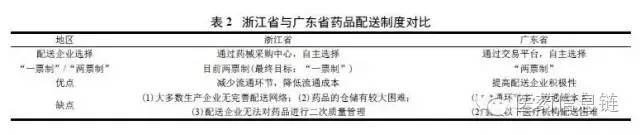 廣東省目前采用“兩票制”,并在配送制度實施過程中與浙江省存在不同之處( 表2)。廣東省藥品配送主要通過藥品交易平臺,由醫(yī)療機構進行自主選擇,強調(diào)市場化,保證了配送企業(yè)公平競爭。同時,廣東省衛(wèi)計委對藥品配送、醫(yī)療機構進行嚴格監(jiān)管。然而在配送過程中,由于縣級以下的衛(wèi)生院及醫(yī)療機構成交量太小,配送企業(yè)配送成本過高,存在配送不到位等情況。但藥品配送企業(yè)積極性較高,對藥品生產(chǎn)企業(yè)的配送能力要求較低。