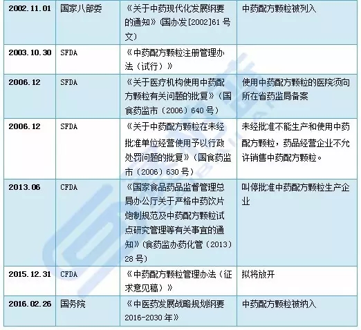 2016年3月1日《中藥配方顆粒管理辦法(征求意見稿)》結(jié)束向社會公開征求意見,行業(yè)開放的趨勢已明朗,業(yè)內(nèi)預(yù)計(jì)不久放開政策將正式出臺,打破此前僅有6家企業(yè)生產(chǎn)的局面。