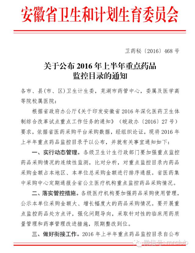 根據(jù)省政府辦公廳《關(guān)于印發(fā)安徽省2016年深化醫(yī)藥衛(wèi)生體制綜合改革試點(diǎn)重點(diǎn)工作任務(wù)的通知》(皖政辦〔2016〕27號(hào))要求,依據(jù)省醫(yī)藥采購(gòu)平臺(tái)采購(gòu)數(shù)據(jù),經(jīng)組織論證,現(xiàn)將2016年上半年重點(diǎn)藥品監(jiān)控目錄予以公布,并就有關(guān)事宜通知如下: