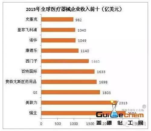 Qmed整理的來自標普旗下的S&PCapitalIQ數(shù)據(jù)顯示,2015年強生公司以2584億美元的的總收入位居全球榜首,美敦力、GE、西門子都在其后,分別位于第二、三、六名。