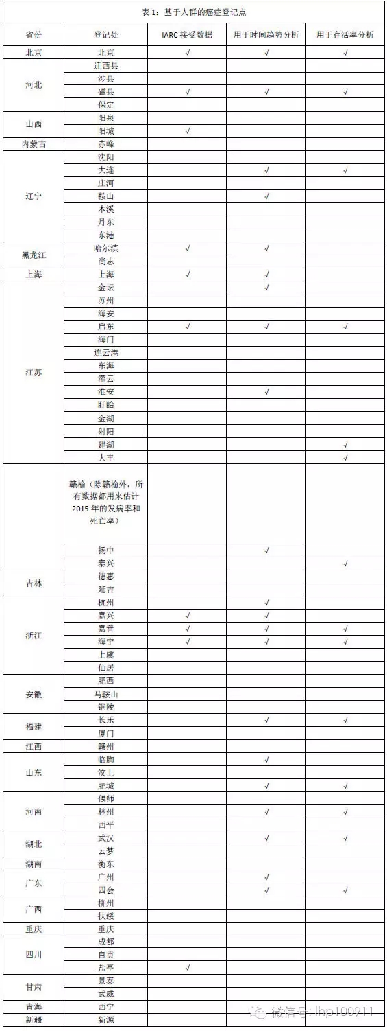 為了估計(jì)2015年中國(guó)新增癌癥數(shù)量,我們使用72個(gè)基于人群的癌癥登記點(diǎn)的最近的數(shù)據(jù)(2009-2011登記的癌癥病例)(表1),人口覆蓋8850萬(wàn)人,大概為全國(guó)人口的6.5%。表1的更少數(shù)量的登記點(diǎn)(22個(gè))提供了4440萬(wàn)人口的覆蓋率,有著2000-2011這12年的高質(zhì)量數(shù)據(jù),用于發(fā)病率的時(shí)間趨勢(shì)分析。這兩套數(shù)據(jù)的癌癥登記點(diǎn)可以在表1中查找到。