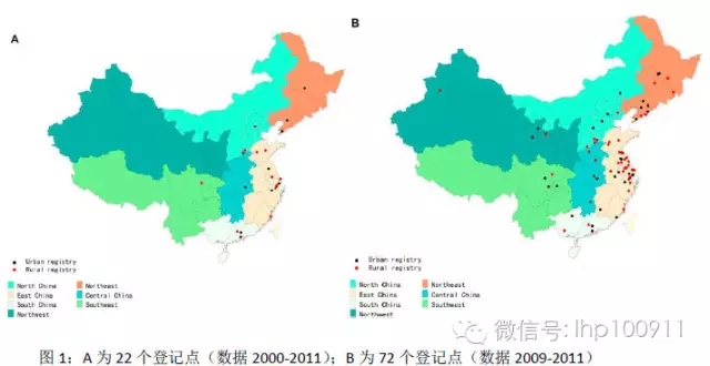 我們采用72個(gè)登記點(diǎn)編制的數(shù)據(jù)來(lái)估計(jì)2015年中國(guó)的癌癥死亡人數(shù)。為了估計(jì)2000-2011之間癌癥致死的趨勢(shì),我們使用了22個(gè)登記點(diǎn)的數(shù)據(jù)來(lái)分析。這些登記點(diǎn)的癌癥死亡數(shù)據(jù)來(lái)自地方醫(yī)院、社區(qū)衛(wèi)生中心、人口統(tǒng)計(jì)(包括來(lái)自國(guó)家疾病監(jiān)測(cè)系統(tǒng)DSP的數(shù)據(jù))和民政局。DSP系統(tǒng)由衛(wèi)生部于上世紀(jì)80年代建立,例行收集由醫(yī)院提供的死亡認(rèn)證信息,或者在死亡認(rèn)證不可用的情況下采用按家走訪(fǎng)的方式收集。盡管DSP使用具有全國(guó)代表性的位點(diǎn)樣本,但這仍然只覆蓋了很小的一部分人口(不到1%)。