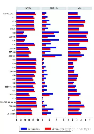 圖 2:兩套癌癥登記數(shù)據(jù)質(zhì)量的三個(gè)主要測(cè)量指標(biāo)。最左邊的一列數(shù)字是ICD10 的分類(lèi)標(biāo)準(zhǔn)。DCO%只表征具有死亡認(rèn)證的癌癥病例百分比。M/I 為死亡率/發(fā)病率;MV%為形態(tài)學(xué)驗(yàn)證的比率。