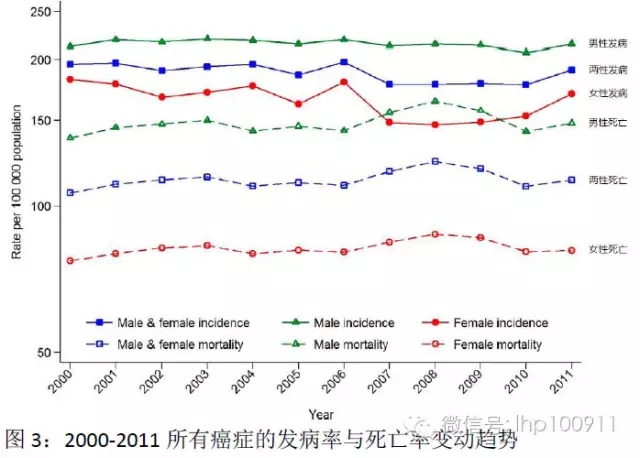 從2000年到2011年發(fā)病率和死亡率的時(shí)間趨勢(shì)分析是通過(guò)將連接點(diǎn)模型與對(duì)數(shù)轉(zhuǎn)化的、年齡標(biāo)準(zhǔn)化的比率來(lái)進(jìn)行計(jì)算的。為了減少這段時(shí)間內(nèi)報(bào)道錯(cuò)誤改變的可能性,我們將所有的模型限制在最大2個(gè)連接點(diǎn)之內(nèi)。趨勢(shì)表達(dá)為年度變化百分比(APC),我們用Z測(cè)試來(lái)評(píng)估APC是否在統(tǒng)計(jì)學(xué)上偏離了0。在描述趨勢(shì)時(shí),術(shù)語(yǔ)“增加”或“減少”用于趨勢(shì)的斜率(APC)統(tǒng)計(jì)學(xué)顯著時(shí)(P<。05)。對(duì)于非統(tǒng)計(jì)學(xué)分析,我們使用術(shù)語(yǔ)“穩(wěn)定”。對(duì)于所有的分析,我們都分性別陳述所有癌癥與10種最常見(jiàn)癌癥的結(jié)果。