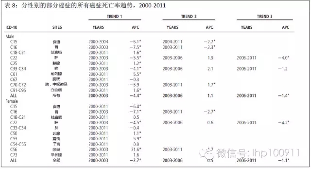 胃癌、食道癌、肝癌的發(fā)病率和死亡率都有明顯減少。盡管發(fā)病率減少了,但人口基數(shù)的增加和老齡化仍然使得新增病例的數(shù)量非常大。對(duì)感染的控制可能也對(duì)這個(gè)趨勢(shì)有影響,比如對(duì)導(dǎo)致肝癌的HBV、HCV的控制,對(duì)導(dǎo)致