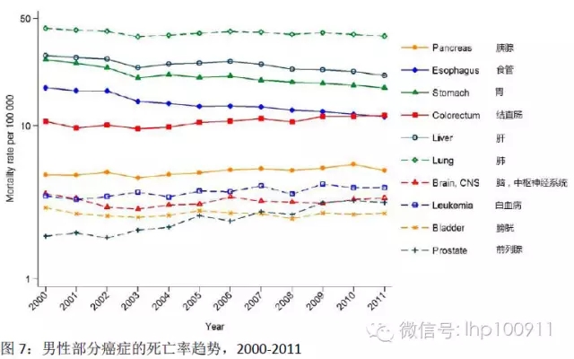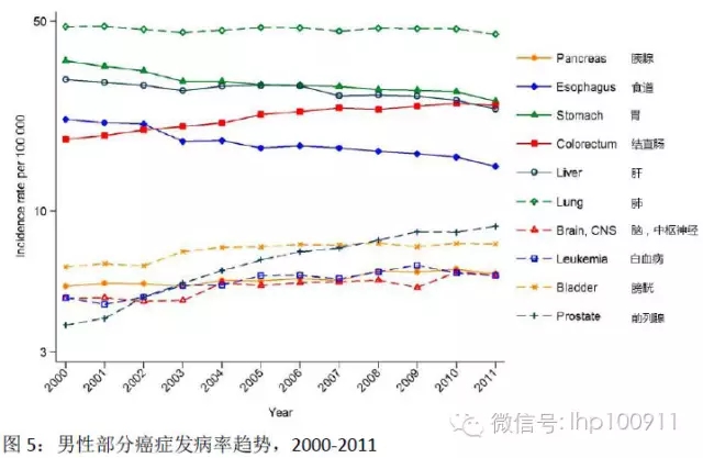 對(duì)于男性,在10種最普遍的癌癥中,以時(shí)間趨勢(shì)分析,從2000年到2011年發(fā)病率增加的有6種,(胰腺癌,結(jié)直腸癌,腦和中樞神經(jīng)系統(tǒng)癌癥,前列腺癌,膀胱癌,白血?。?,而胃癌、食道癌、肝癌則有下降(P<.05)。肺癌的趨勢(shì)則比較穩(wěn)定(圖5,表7)。