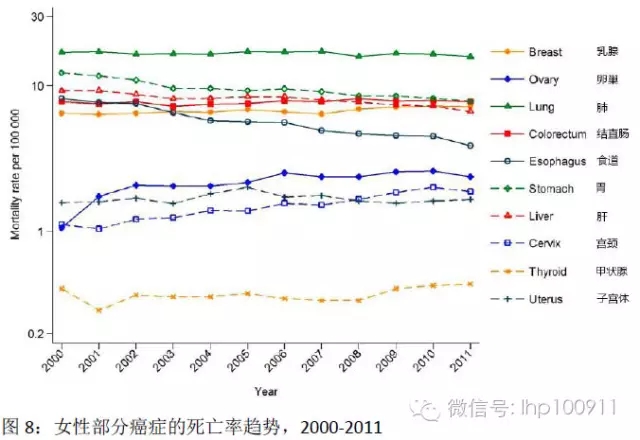 對(duì)于女性,最普遍的10種癌癥中3種的死亡率上升(乳腺癌,宮頸癌和卵巢癌),結(jié)直腸癌、肺癌、子宮體癌和甲狀腺癌趨勢(shì)較為穩(wěn)定。(圖8,表8)。