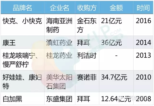 近年來,品牌OTC企業(yè)賣掉也算不得什么新鮮事了。2013年,英國快消領(lǐng)域巨頭利潔時收購OTC品牌藥企桂龍藥業(yè);2014年,拜耳公司以36億元的價格收購了滇虹藥業(yè)集團100%股權(quán)。而更早的,賽諾菲收購太陽石藥業(yè)、拜耳收購白加黑等等。