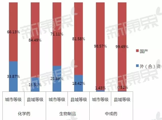 等級醫(yī)院用藥市場中,外(合)資企業(yè)銷售份額占24%,即絕大部分藥物市場被國內(nèi)企業(yè)占領(lǐng)。無論是化藥、中成藥還是生物制品,城市等級醫(yī)院的外資企業(yè)銷售占比均高于縣域等級,與之對應(yīng)的,縣域等級醫(yī)院的國產(chǎn)藥物普及程度比城市等級醫(yī)院更高。