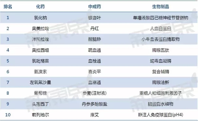 等級醫(yī)院TOP10化藥/中成藥/生物制品通用名排行(按銷售額份額排名)