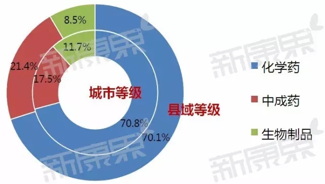 2015年等級醫(yī)院化藥/中成藥/生物制品市場份額占比(城市等級vs縣域等級)