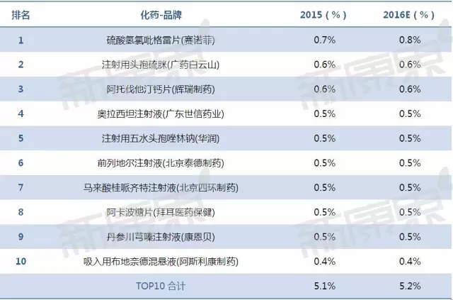等級醫(yī)院TOP10化藥品牌銷售額份額排行榜