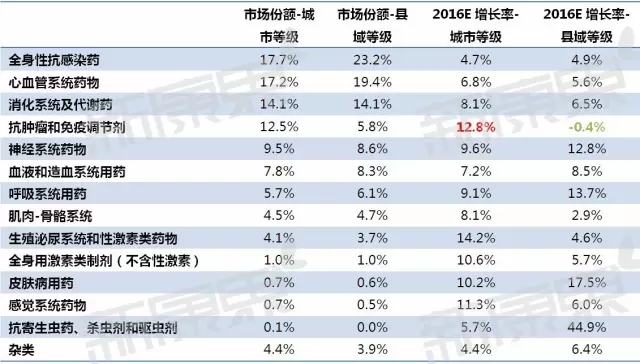 城市、縣域等級醫(yī)院用藥各品類市場分布大致相似。城市等級醫(yī)院抗腫瘤和免疫調(diào)節(jié)劑份額、增長速度均明顯高于縣域等級。12.5%的市場占比,增速12.8%,抗腫瘤和免疫調(diào)節(jié)劑品類可能是驅(qū)動城市等級醫(yī)院用藥市場2016年增速超越縣級醫(yī)院的主要市場之一。