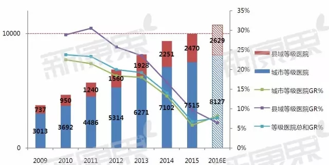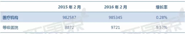 根據(jù)國家衛(wèi)計委統(tǒng)計數(shù)據(jù),截至2016年2月底,全國等級醫(yī)院共9721個,與2015年2月相比增加9.57%,遠(yuǎn)遠(yuǎn)超過醫(yī)療機構(gòu)整體增長水平。
