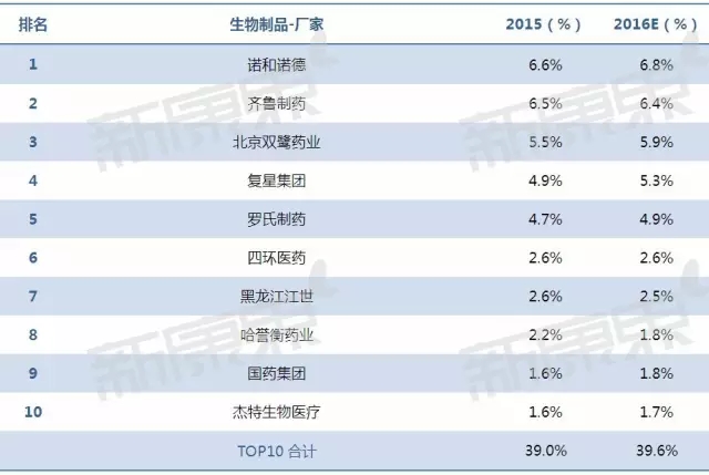 等級醫(yī)院TOP10生物制品廠家銷售額份額排行榜