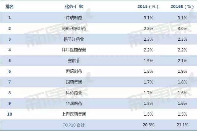 等級醫(yī)院TOP10化藥廠家銷售額份額排行榜