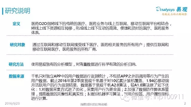 2016年9月23日,易觀發(fā)布了《中國醫(yī)藥O2O市場專題研究報(bào)告2016》的專題研究報(bào)告,報(bào)告對(duì)中國醫(yī)藥O2O市場發(fā)展概況、實(shí)踐案例及發(fā)展趨勢做了詳細(xì)的研究分析。