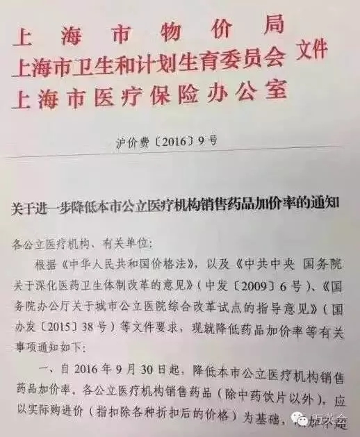 根據(jù)《關(guān)于進一步降低本市公立醫(yī)療機構(gòu)銷售藥品加價率的通知》(滬價費
