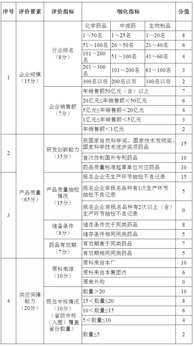 藥品質(zhì)量評價指標分值共100分,主要對企業(yè)規(guī)模、藥品質(zhì)量、供應(yīng)保障能力等指標進行綜合評價。