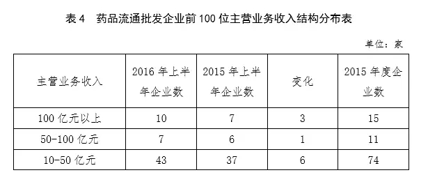2016年上半年前百位藥品批發(fā)企業(yè)主營(yíng)業(yè)務(wù)收入 5290 億元,占全行業(yè)主營(yíng)業(yè)務(wù)收入的 67%,比上年同期提高 4 個(gè)百分點(diǎn),其中 10 家超過(guò) 100 億元。