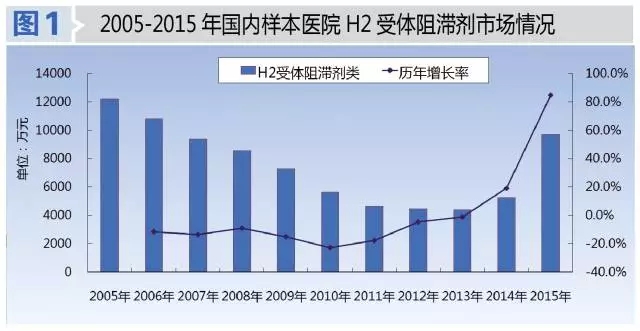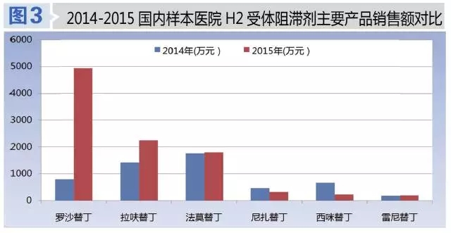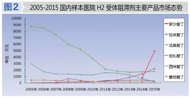 H2-受體拮抗劑是治療消化性潰瘍藥物各子類中均價最低的一個類別。目前,該類藥物市場很難與質(zhì)子泵抑制劑比拼,多年來市場持續(xù)走低,高端市場銷售規(guī)模相對較小。不過近兩年來,H2-受體拮抗劑市場“新貴”羅沙替丁為該類市場增添了新動力。羅沙替丁呈現(xiàn)逆勢增長,2015年已成為H2-受體拮抗劑產(chǎn)品“排頭兵”。