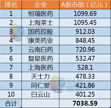 2016年全球十大制藥企業(yè)總市值達(dá)15680億美元,與2015年相比縮水3.7%。國內(nèi)A股市值前十位的藥企總市值為7038.59億元人民幣。