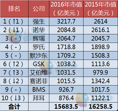 總體來看,今年榜單上前十家藥企總體市值為15680億美元,與2015年16260億美元總市值相比,減少了3.7%。