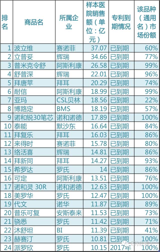 中國(guó)銷售額排名前100的藥品中,26個(gè)來自跨國(guó)藥企,25個(gè)是過了專利期的原研藥,其中24個(gè)過10億元單品,這24個(gè)產(chǎn)品的總銷售額約為411.55億元,沒有懸念排在首位的是賽諾菲的波立維。