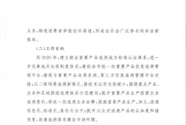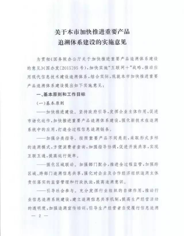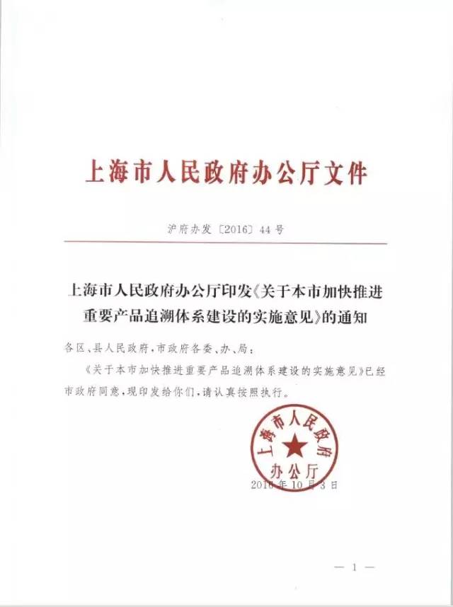 上海市人民政府辦公廳2016年10月3日出臺關(guān)于加快推進重要產(chǎn)品追溯體系建設(shè)提出實施意見,包括基本原則、工作目標(biāo)、主要任務(wù)和保障措施。
