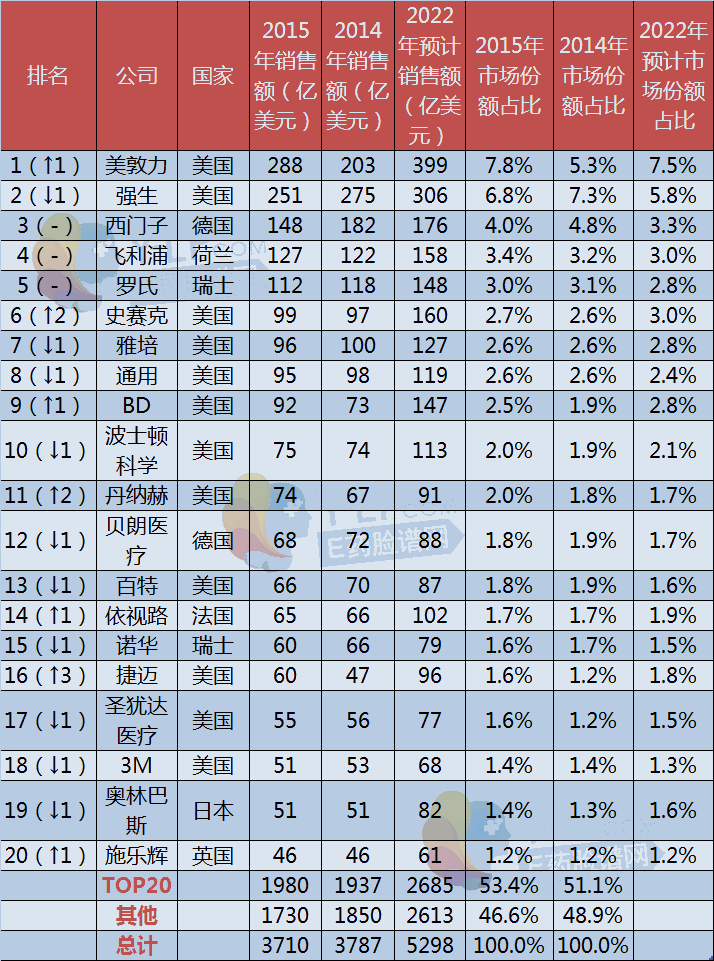 美敦力憑借429億美元收購柯惠醫(yī)療超越強生,成為2015年全球醫(yī)械市場老大,強生以251億美元退居次席。