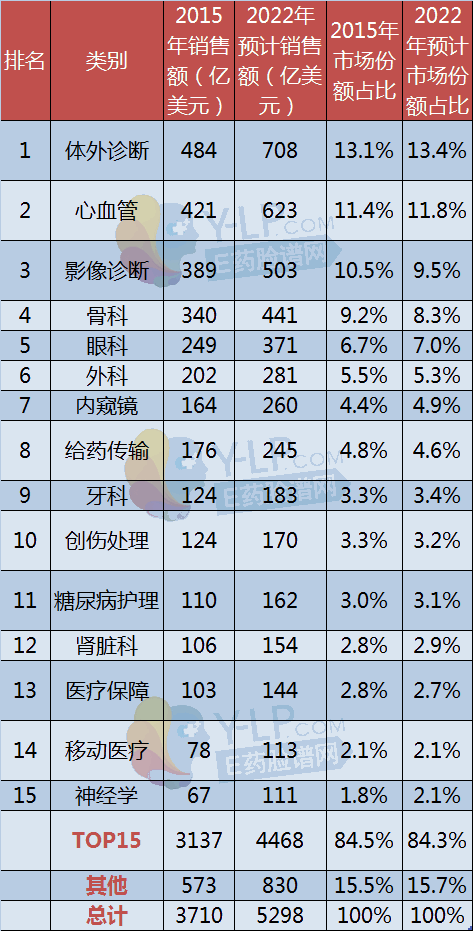 從具體分類來看,TOP15醫(yī)械產(chǎn)品種類2015年銷售額達3137億美元,市場份額為84.5%。預(yù)計2022年TOP15全球銷售額可達4468億美元。其中,體外診斷在2015年依舊火爆,全球年銷售額達到484億美元,預(yù)計2022年銷售額可達708億美元,將占整個醫(yī)械市場13.4%。心血管類2015年銷售額為421億美元,位居第二位,預(yù)計2022年全球銷售額可達623億美元。影像診斷、骨科以及眼科分別以389億美元、340億美元和249億美元排名第三至第五位。