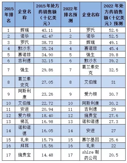 全球2015年處方藥TOP20藥企和2022年處方藥TOP20藥企預(yù)測(cè)