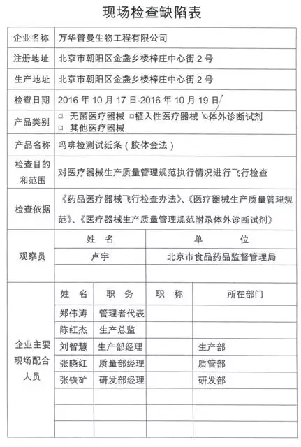 萬華普曼生物工程有限公司現(xiàn)場檢查缺陷表