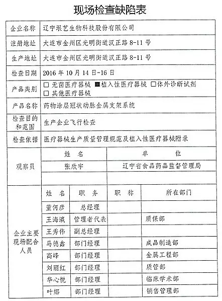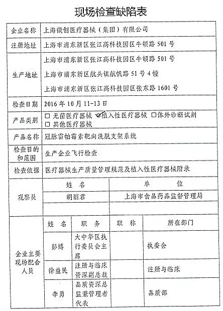 上海微創(chuàng)醫(yī)療器械(集團)有限公司現(xiàn)場檢查缺陷表
