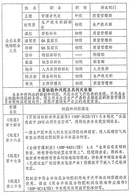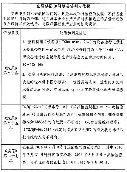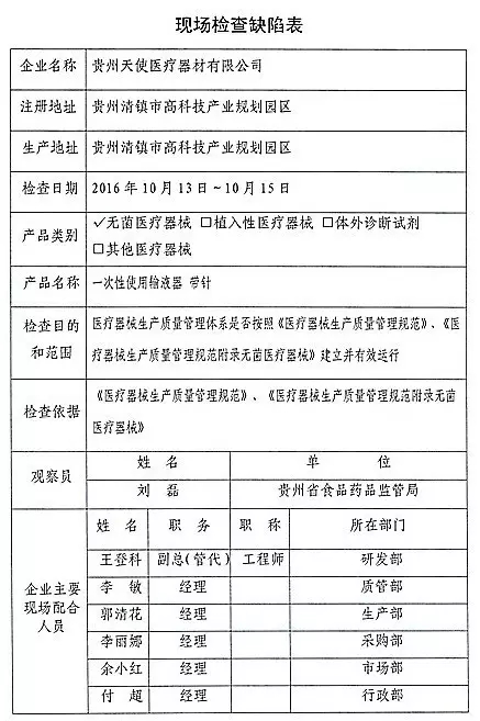 貴州天使醫(yī)療器械有限公司現(xiàn)場檢查缺陷表