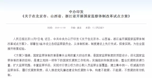 11月7日晚,中國中央辦公廳印發(fā)了《關(guān)于在北京市、山西省、浙江省開展國家監(jiān)察體制改革試點(diǎn)方案》。部署在3省市設(shè)立各級(jí)監(jiān)察委員會(huì),從體制機(jī)制、制度建設(shè)上先行先試、探索實(shí)踐,為在全國推開積累經(jīng)驗(yàn)。