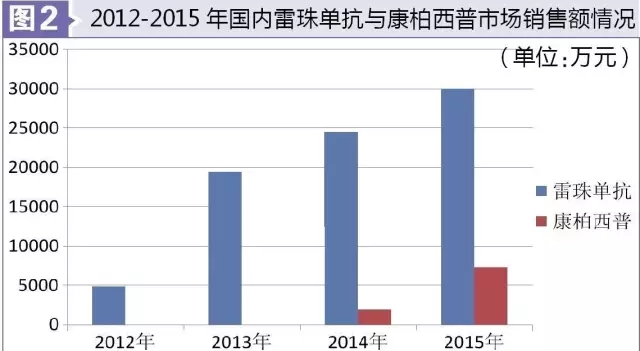 據(jù)樣本醫(yī)院數(shù)據(jù):雷珠單抗2012年銷售額為4854萬元;2013年銷售額為1.94億元,較同期增長299.5%;2014年銷售額為2.45億元,較同期增長26.3%%;2015年銷售額為3.0億元,較同期增長22.3%。該產(chǎn)品2012年上市,短短4年后,其2015年樣本醫(yī)院銷售額已經(jīng)高達(dá)3.0億元。