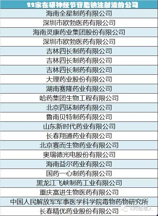 除了這些已經有單唾液酸四己糖神經節(jié)苷脂鈉注射劑上市的公司外,還有22家公司正在進行這一藥物的申報或者臨床試驗,這些公司是:
