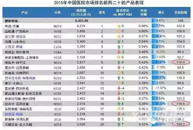但分析一下2015年中國醫(yī)院市場排名前20的藥品,就可以看到,中國醫(yī)藥市場多年來受各種因素的影響,臨床使用較多的藥物,在一定程度上是扭曲的。那些被限制使用的產品,銷售額排名卻靠前。
