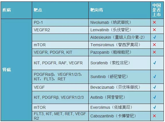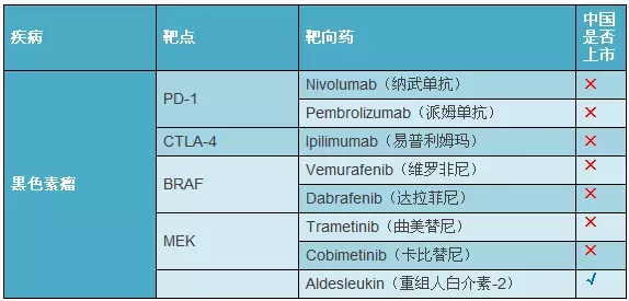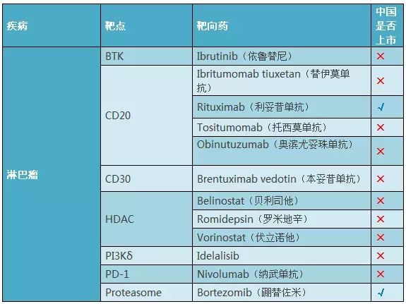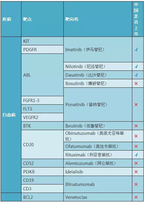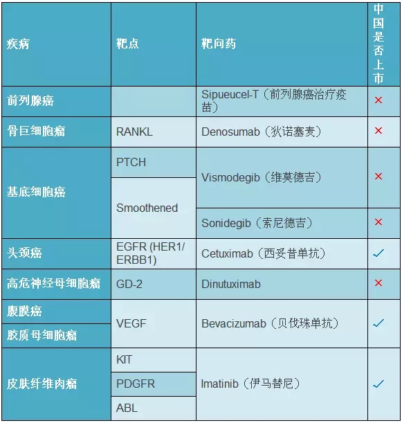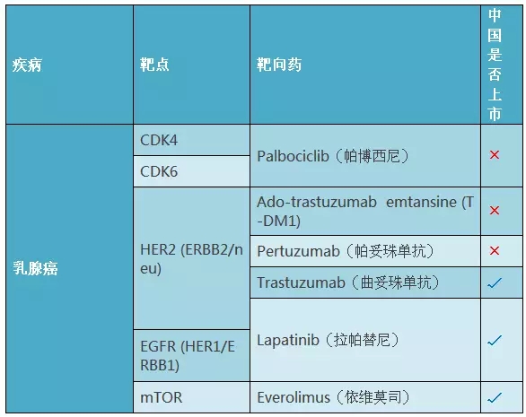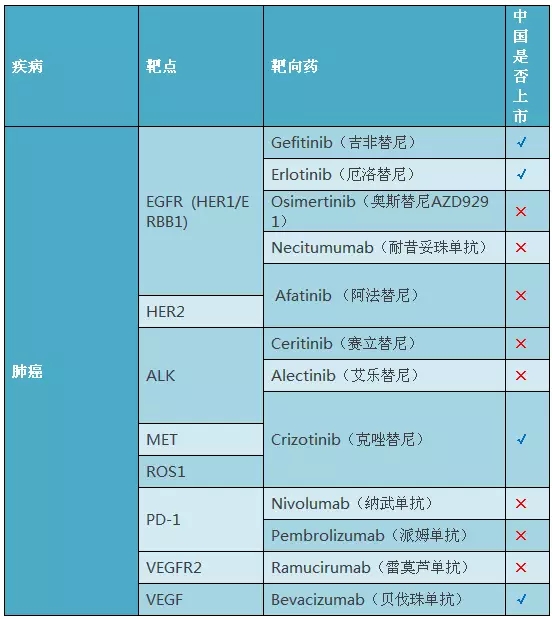 令人欣慰的是,有些患者已經(jīng)到美國就診并使用到了一些新藥,為戰(zhàn)勝癌癥增加了籌碼。更加可喜的是,目前很多新藥的臨床試驗正在國內(nèi)開展,例如免疫療法藥物PD-1抑制劑Nivolumab和Pembrolizumab以及肺癌靶向藥Osimertinib (AZD9291)等。希望中國的患者能早日受益于這些新藥。根據(jù)疾病種類和藥物靶點,我們將靶向藥物及其在中國的上市情況進(jìn)行了匯總。未在中國上市的藥物尚無正式中文名稱,文中提供的中文名為音譯,僅供參考。
