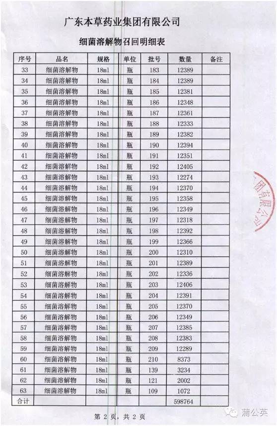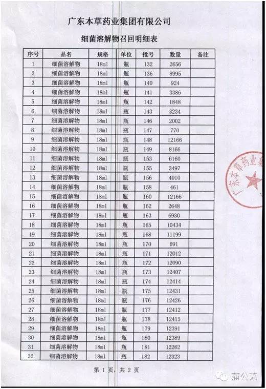 2016年1月18日,總局發(fā)布《關(guān)于停止進(jìn)口腦蛋白水解物等4個(gè)藥品的公告》。其中,意大利貝斯迪大藥廠的細(xì)菌溶解物(商品名:蘭菌凈)因不符合我國(guó)《藥品生產(chǎn)質(zhì)量管理規(guī)范》,已停止進(jìn)口,該品種代理商廣東本草藥業(yè)集團(tuán)有限公司決定主動(dòng)召回相關(guān)產(chǎn)品。目前該企業(yè)已召回全部進(jìn)口通關(guān)的細(xì)菌溶解物(商品名:蘭菌凈),具體批次、數(shù)量見(jiàn)附表。