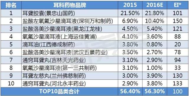 據(jù)中康CMH監(jiān)測數(shù)據(jù)顯示,2015年耳科藥物市場Top10品牌中,耳聾膠囊(景忠山國藥)以21.5%的市場份額穩(wěn)居榜首,鹽酸左氧氟沙星滴耳液(深圳萬和制藥)以6.9%的份額位列第二,預(yù)計2016年市場份額將達到10.4%。