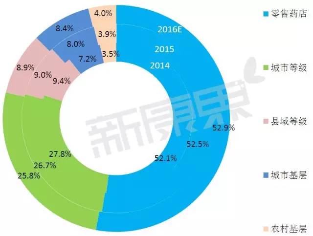 圖2 2014-2016E年耳鼻喉科藥物渠道市場份額