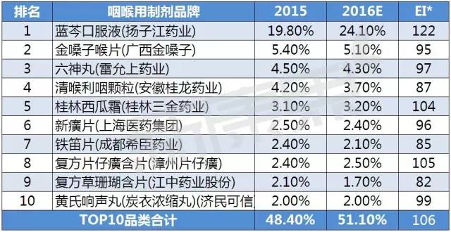 2015年咽喉藥物市場TOP10品牌中,市場份額占比最大的是藍芩口服液(揚子江藥業(yè)),以19.8%排名第一。藍芩口服液在醫(yī)院市場保持快速的增長,另外基層醫(yī)藥的增長同時也帶動其在藥店的銷售,預(yù)計2016年市場份額較2015年有較大提升。