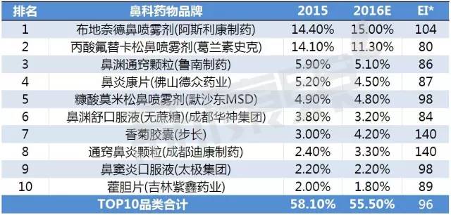 2015年鼻科藥物市場TOP10品牌中,由外資企業(yè)的阿斯利康制藥和葛蘭素史克生產(chǎn)的布地奈德鼻噴霧劑和丙酸氟替卡松鼻噴霧劑銷售額份額分別排名一二;從EI指數(shù)來看,市場份額上升速度最快的前3個品牌分別是布地奈德鼻噴霧劑(阿斯利康制藥)、香菊膠囊(步長)及通竅鼻炎顆粒(成都迪康制藥)。