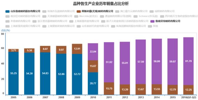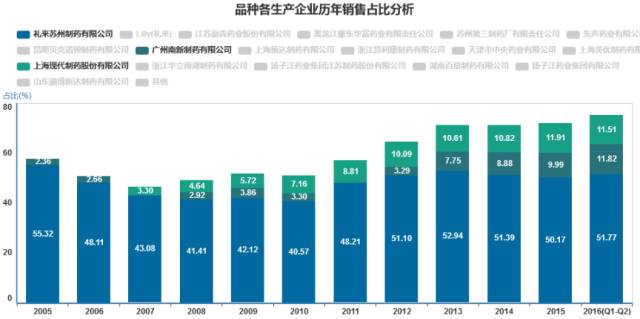 禮來與億騰的交易,又回到熟悉的套路上:市場容量有限,原研藥市場份額逐年壓縮,投入資源看不到增長,原研商急需甩掉包袱輕裝上陣?!跋?虅凇焙汀胺€(wěn)可信”這兩個(gè)品牌早已跌出全球暢銷藥500強(qiáng)榜單,根據(jù)PDB全球銷售數(shù)據(jù)庫,2015年頭孢克洛通用名藥全球銷售額3.37億美元,萬古霉素通用名藥全球銷售額為7.4億美元?!跋?虅凇钡膰鴥?nèi)市場占有率起起伏伏,廣州南新增長勢頭迅猛。