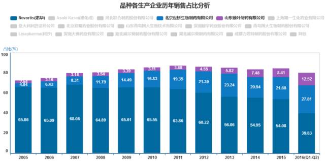 泰凌醫(yī)藥豪擲10億收購諾華的“密蓋息”( 鮭降鈣素),顯示出其對自身銷售能力的自信。PDB數(shù)據(jù)庫顯示,2015年“密蓋息”樣本醫(yī)院銷售額8200萬,但是其市場份額逐年走低。山東綠葉和北京世橋?qū)?huì)是泰凌醫(yī)藥在這個(gè)市場中強(qiáng)有力的競爭者。