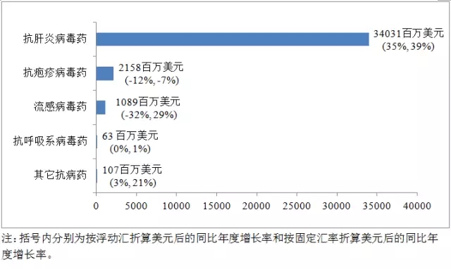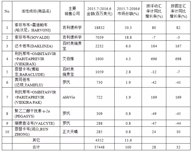 表1 全球抗病毒藥Top 10產(chǎn)品(單位:百萬美元)
