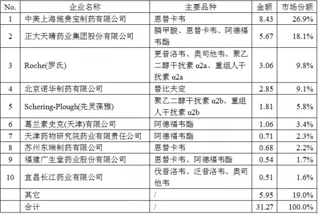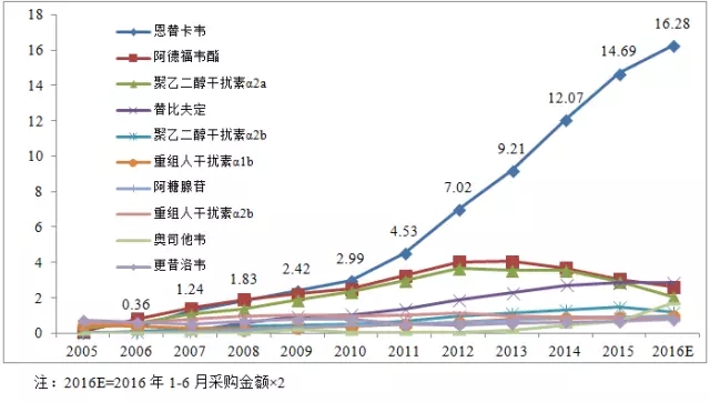 據(jù)PDB數(shù)據(jù),國內(nèi)樣本醫(yī)院抗病毒藥品種采購金額領(lǐng)先的10個(gè)品種為:恩替卡韋、阿德福韋酯、聚乙二醇干擾素α2a、替比夫定、聚乙二醇干擾素α2b、重組人干擾素α1b、阿糖腺苷、重組人干擾素α2b、奧司他韋、更昔洛韋。
